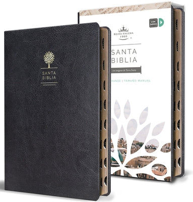 Biblia tamaño manual, ultrafina, con letra grande. Símil piel negro, con índice en el canto, cinta marcadora y fotos a color de Tierra Santa.